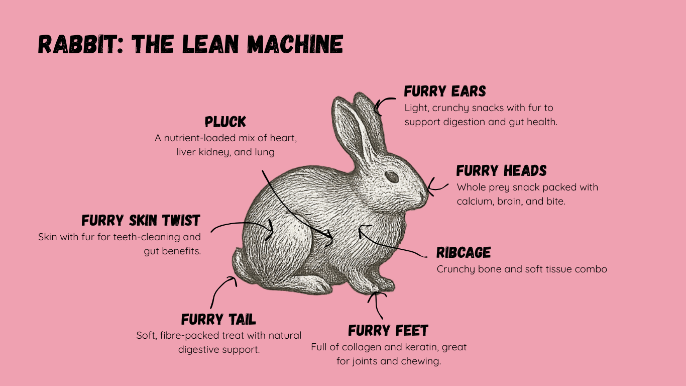 We use the whole rabbit, heads, feet, skin, organs and bones , basically everything that’s leftover once the human cuts are taken (which isn’t a lot). This gives your dog a balanced, biologically appropriate snack that mirrors a natural prey diet.